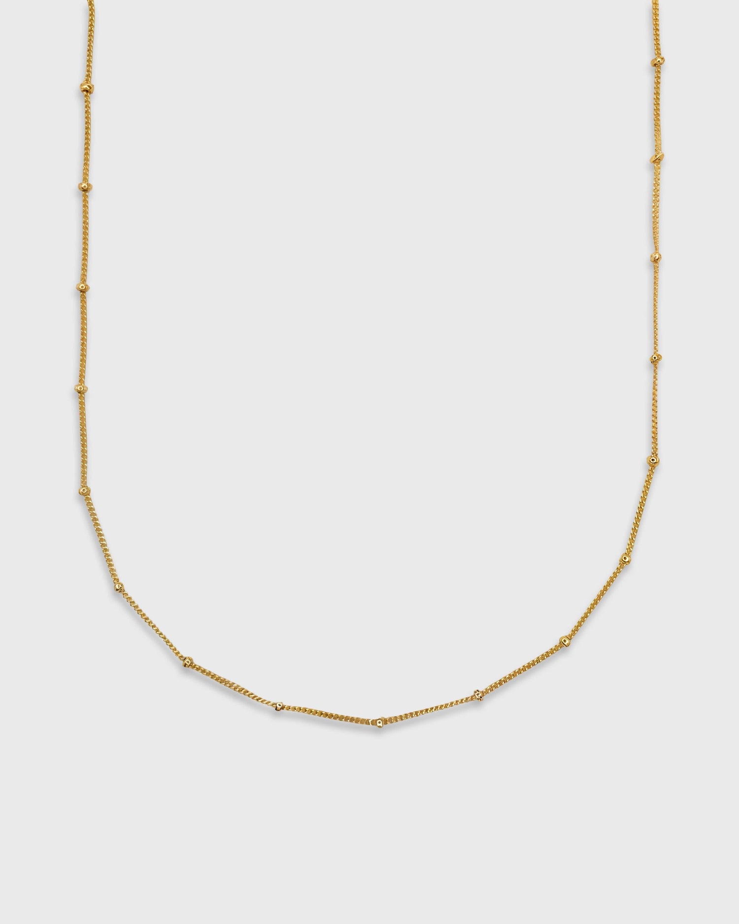 Épuré et lumineux, le collier Arani en chaîne fine dorée à l’or 24 carats se ponctue de délicates petites perles, telles des éclats de lumière suspendus. Minimaliste et intemporel, il se porte comme un fil d’or discret qui souligne le cou avec élégance.