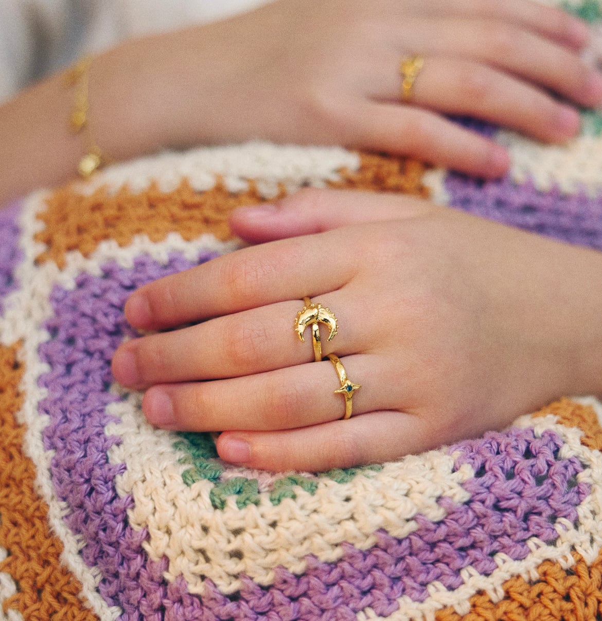 Un fin anneau doré à l'or recyclé 24 carats, confectionnée avec soin dans notre atelier à Paris, notre bague pour enfants et femme Mounia est d'une grande poésie avec sa lune qui nous berce de sa paisible lueur.