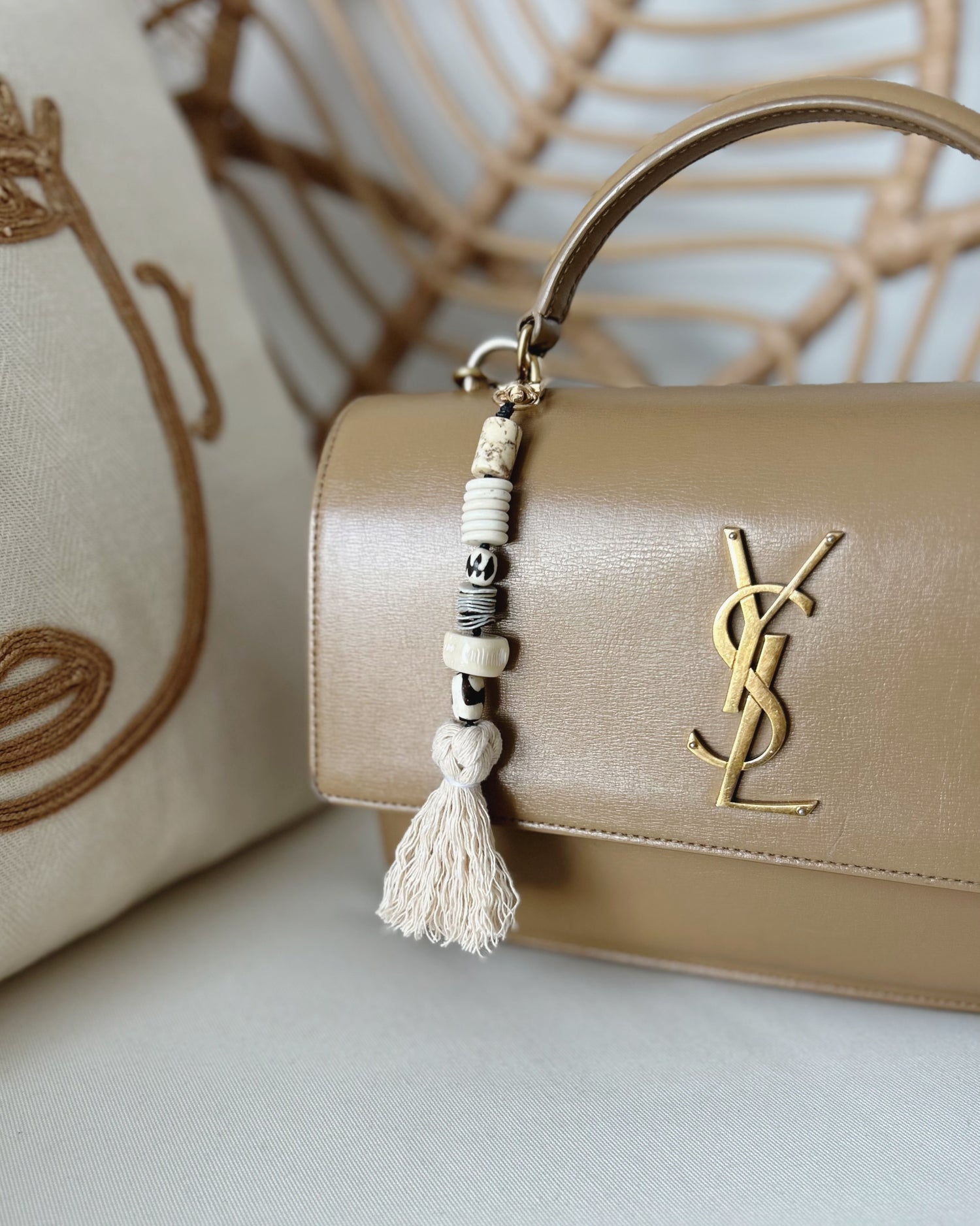 Graphique et solaire, Ithaca est un bijou de sac entièrement monté à la main dans notre atelier parisien. Il associe des perles artisanales aux nuances d’ivoire et de noir, jouant sur les contrastes et les textures. Chaque perle, unique par sa forme et ses reliefs, crée un rythme organique et poétique.