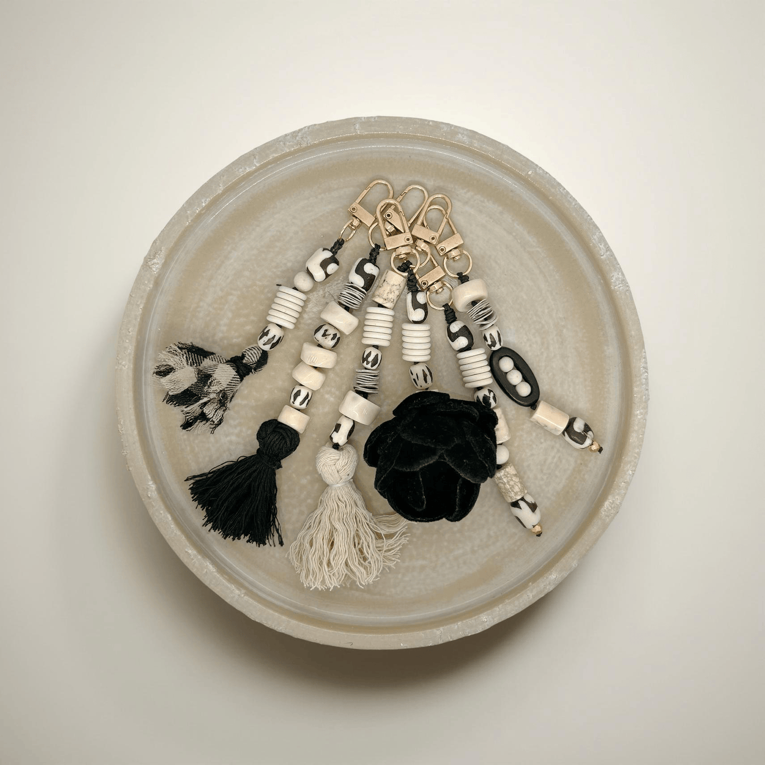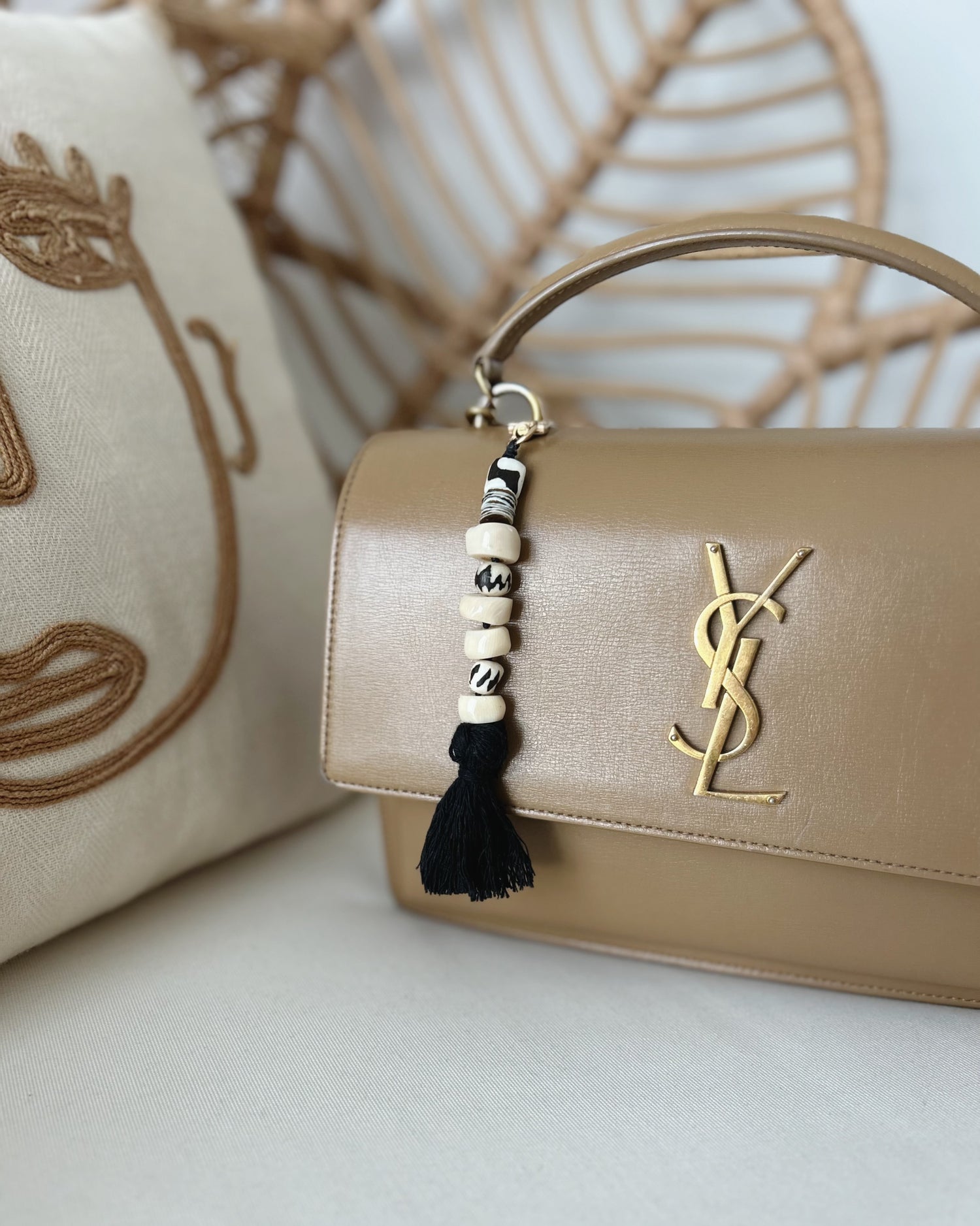 Le bijou de sac Ephese associe des perles artisanales aux nuances ivoire, marbrées et noires, et fil de coton tressé.