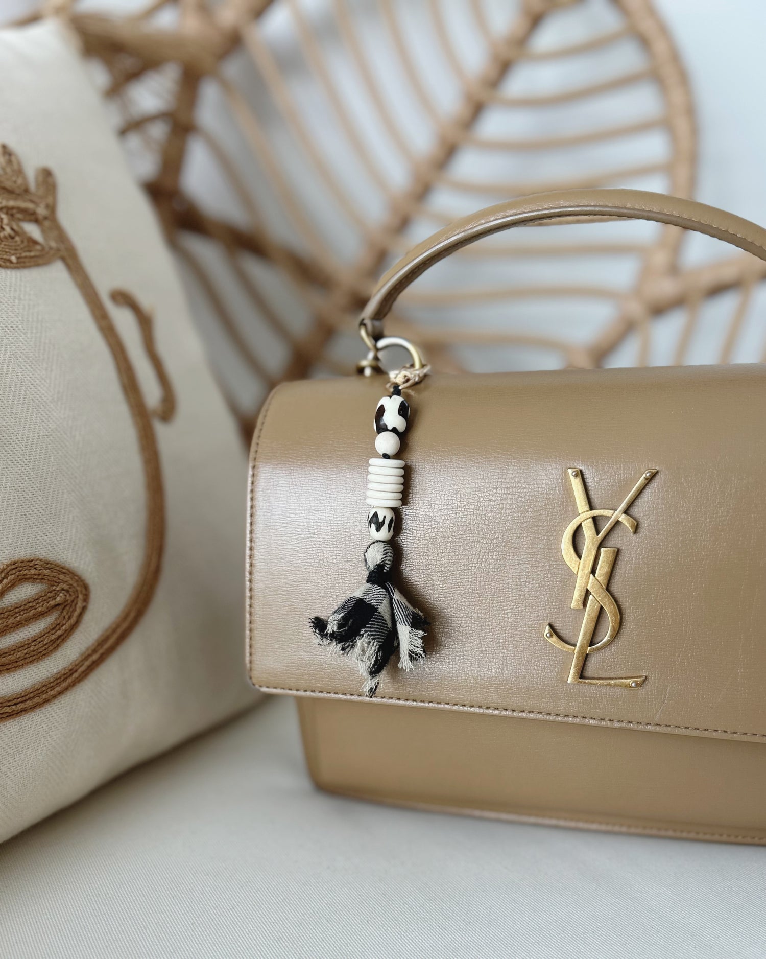 Le bijou de sac Larissa marie textures et contrastes dans un esprit à la fois artisanal et contemporain. Assemblé à la main dans notre atelier parisien, il associe des perles façonnées une à une, aux nuances d’ivoire et de noir, à un pompon en coton tissé noir et blanc, au fini brut et effiloché.