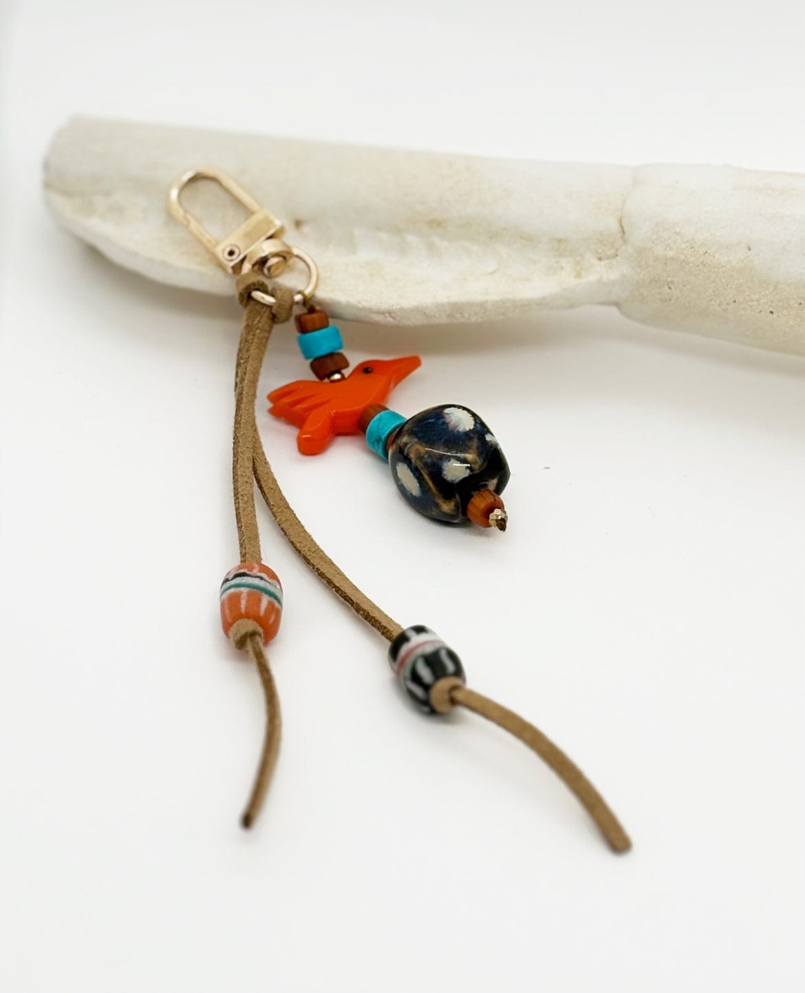 Le bijou de sac Plano, fabriqué à Paris, mélange perles en céramiques aux teintes naturelles, pierres sculptées naturelles et liens de suédine pour un esprit bohème et raffiné. Un accessoire unique qui sublime votre sac avec une touche artisanale et élégante.