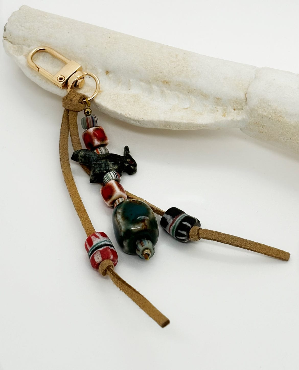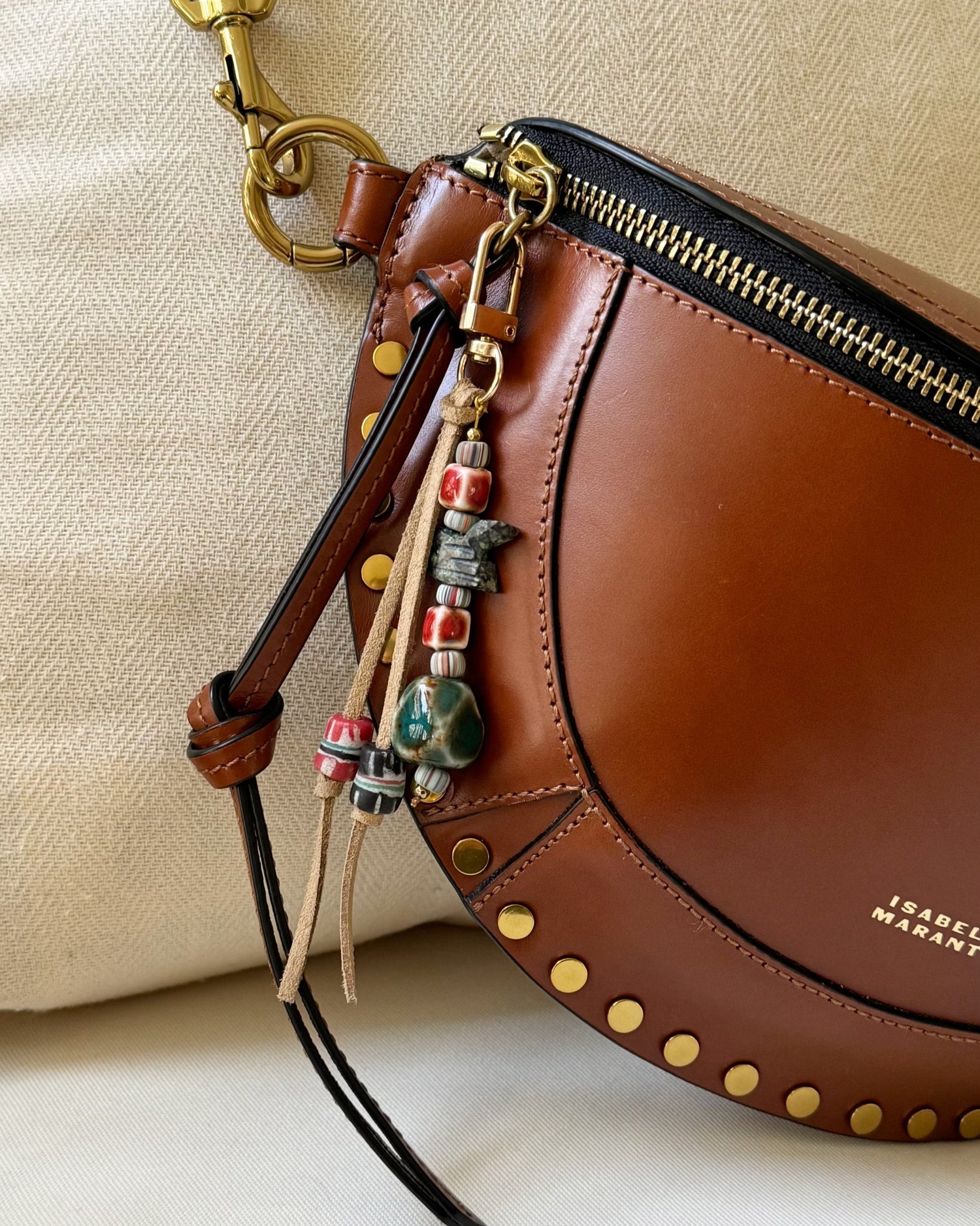Le bijou de sac Plano, fabriqué à Paris, mélange perles en céramiques aux teintes naturelles, pierres sculptées naturelles et liens de suédine pour un esprit bohème et raffiné. Un accessoire unique qui sublime votre sac avec une touche artisanale et élégante.