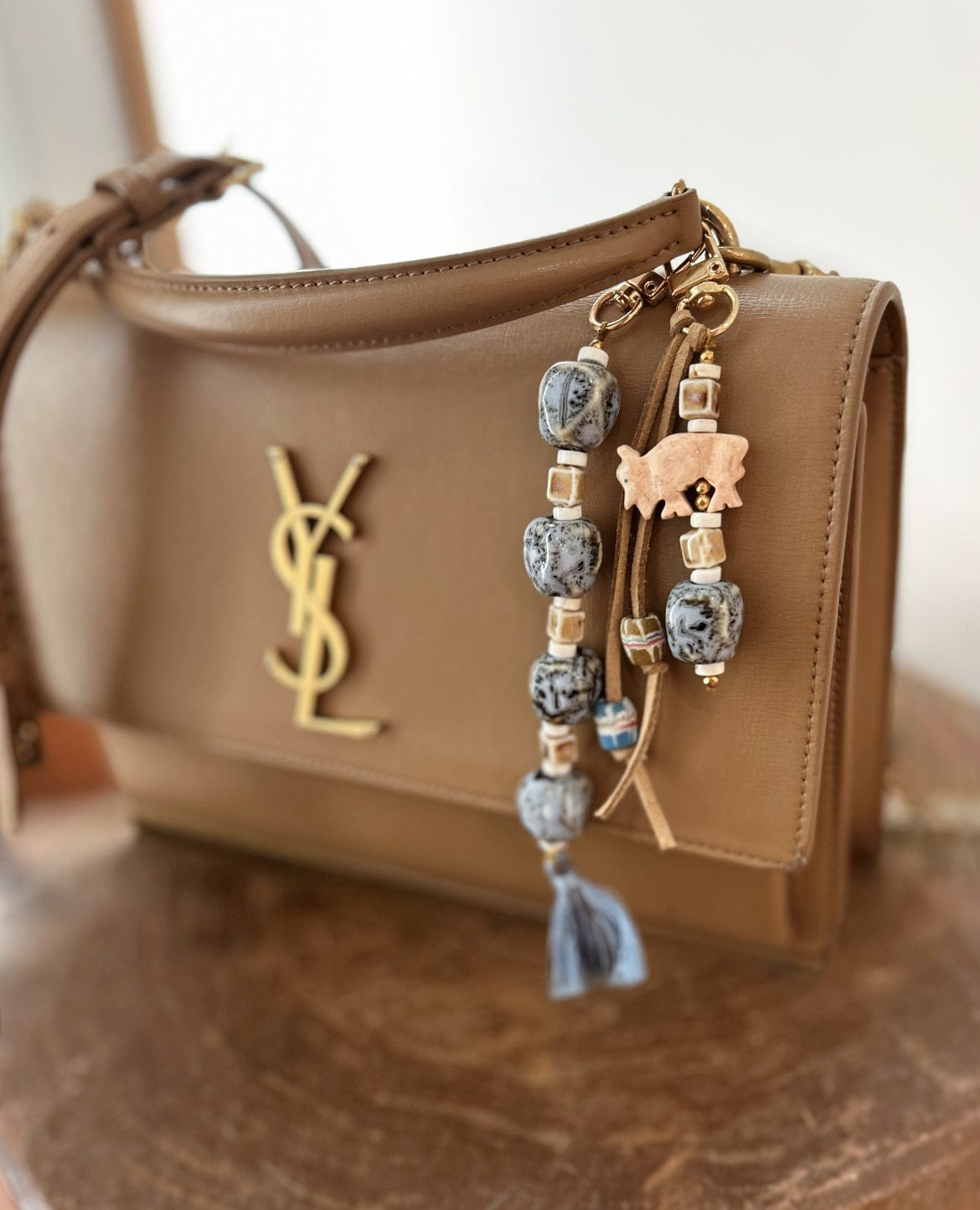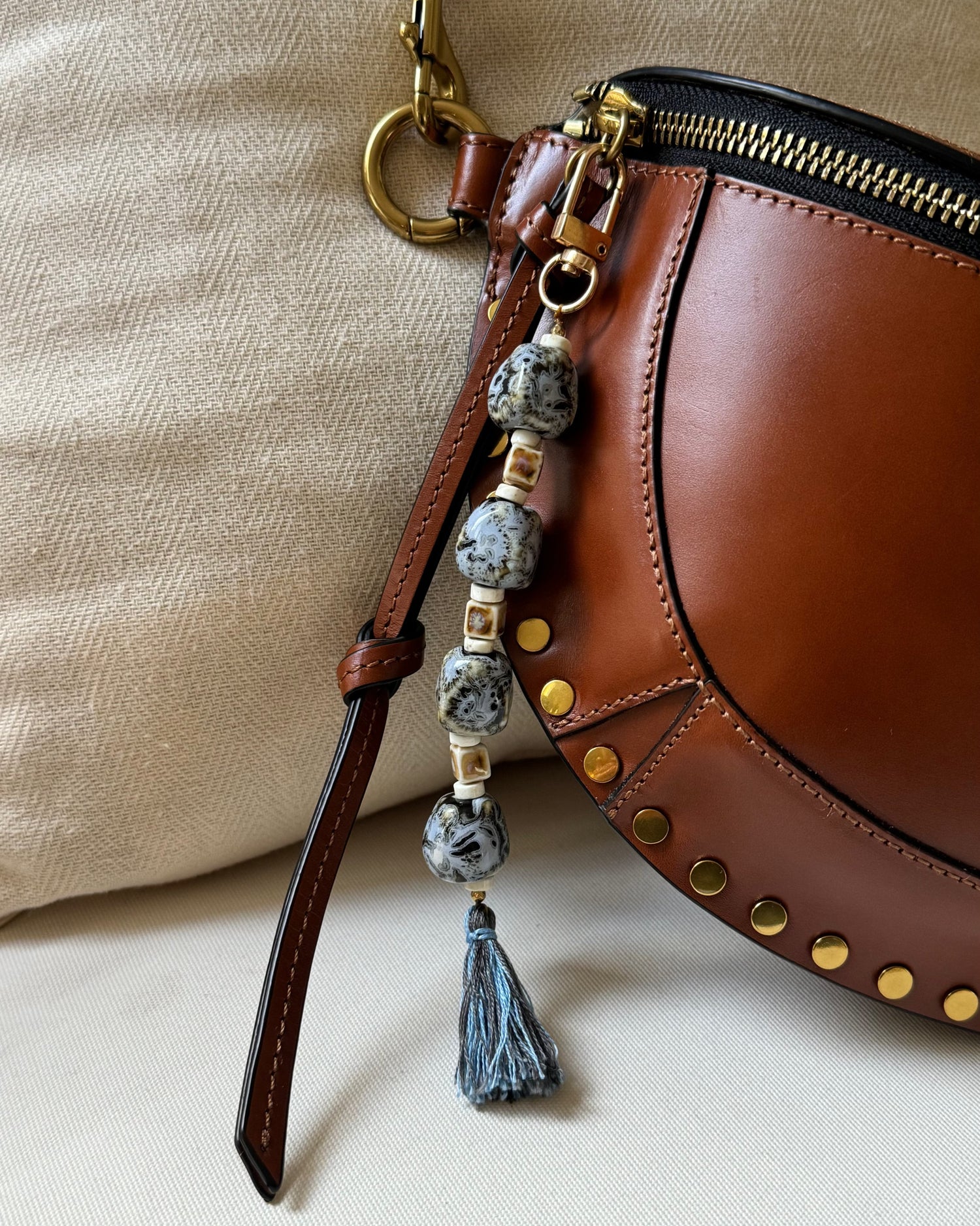 Le bijou de sac Dali, fabriqué à Paris, se distingue par ses perles en céramique aux nuances profondes, associées à des pierres naturelles et un pompon de coton élégant. Un accessoire raffiné pour personnaliser votre sac avec originalité et caractère.