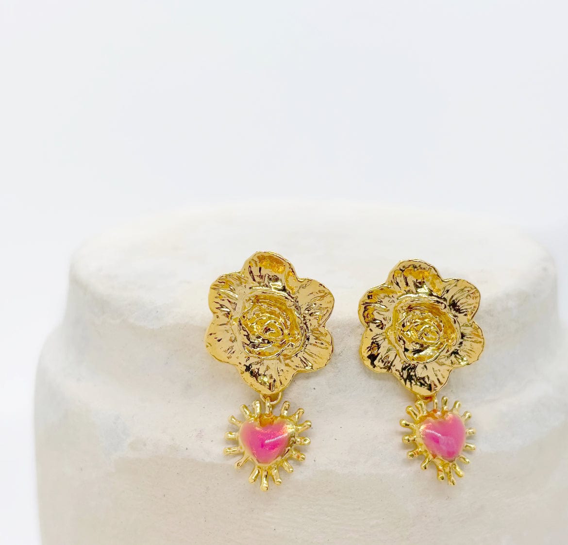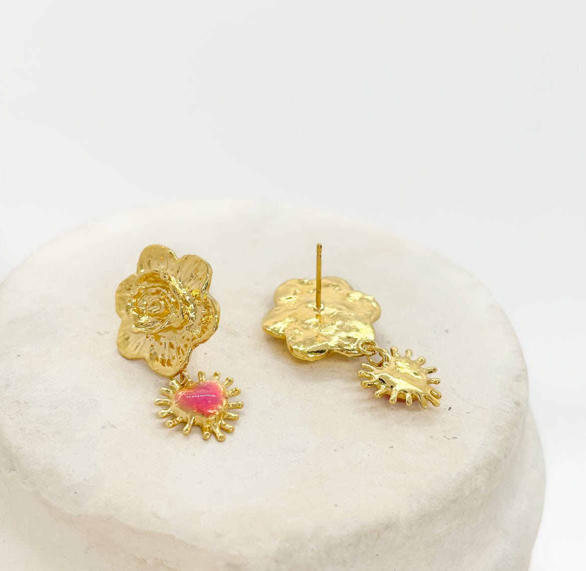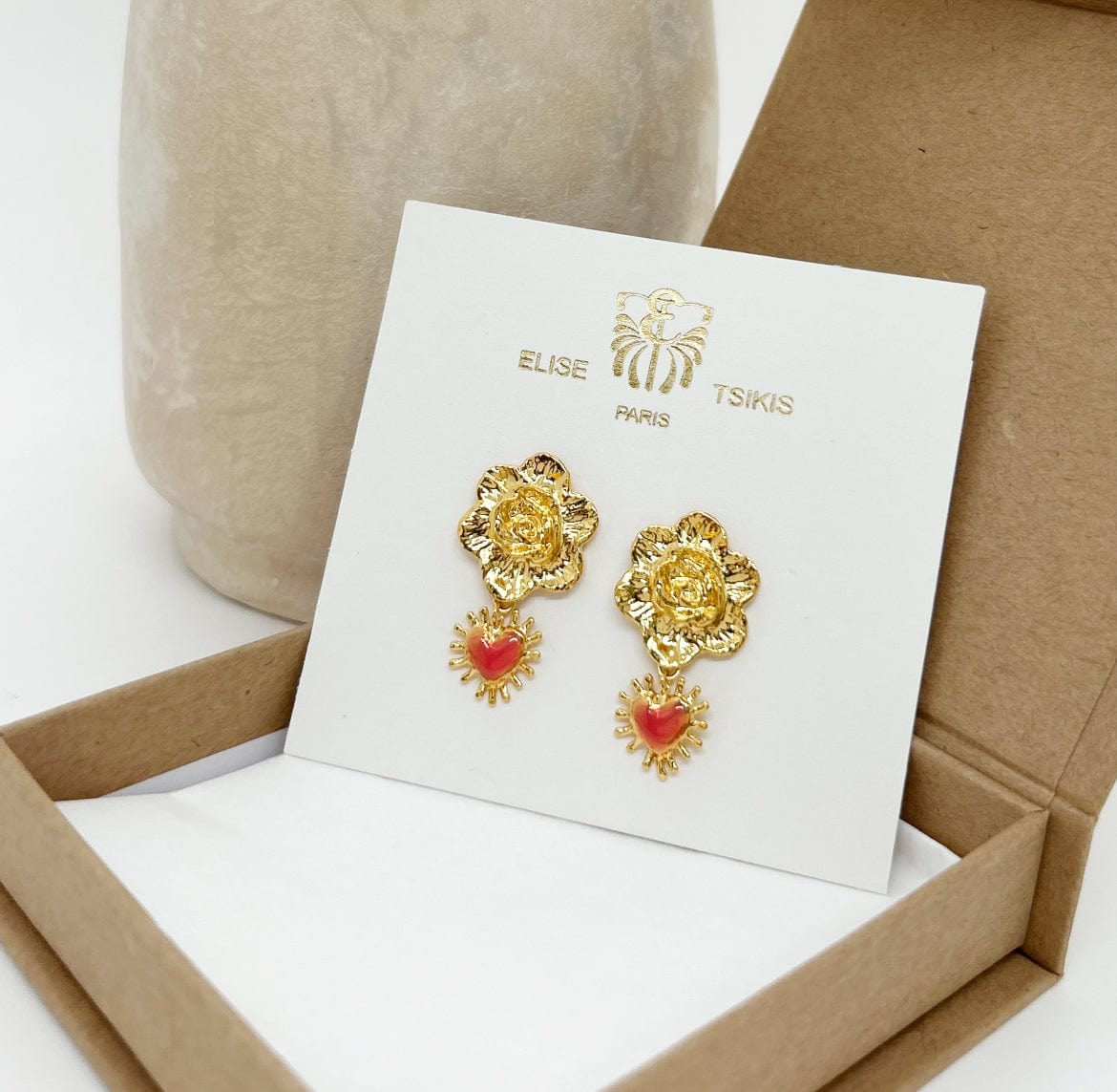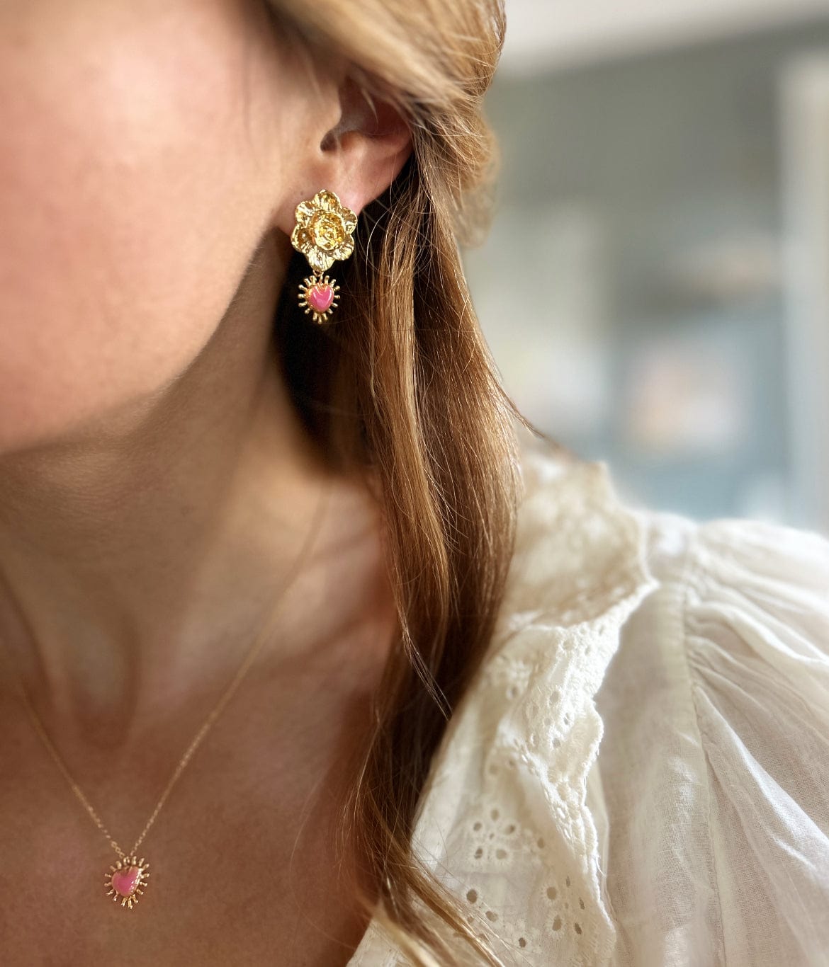 Les boucles d'oreilles pendantes Flores ont été sculptées dans la cire et réalisées dans notre atelier parisien. Ce modèle composé d'une fleur et d'un cœur illuminera votre visage grâce à sa couleur solaire et chaleureuse.