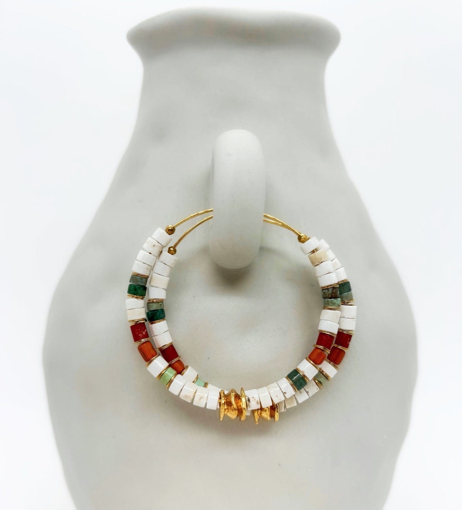 Les créoles Massey, fabriquées à Paris, allient élégance artisanale et inspirations bohèmes. Le mélange raffiné de perles colorées et de détails dorés leur confère un charme unique. Un bijou éclatant qui sublime chaque tenue avec une touche de sophistication.