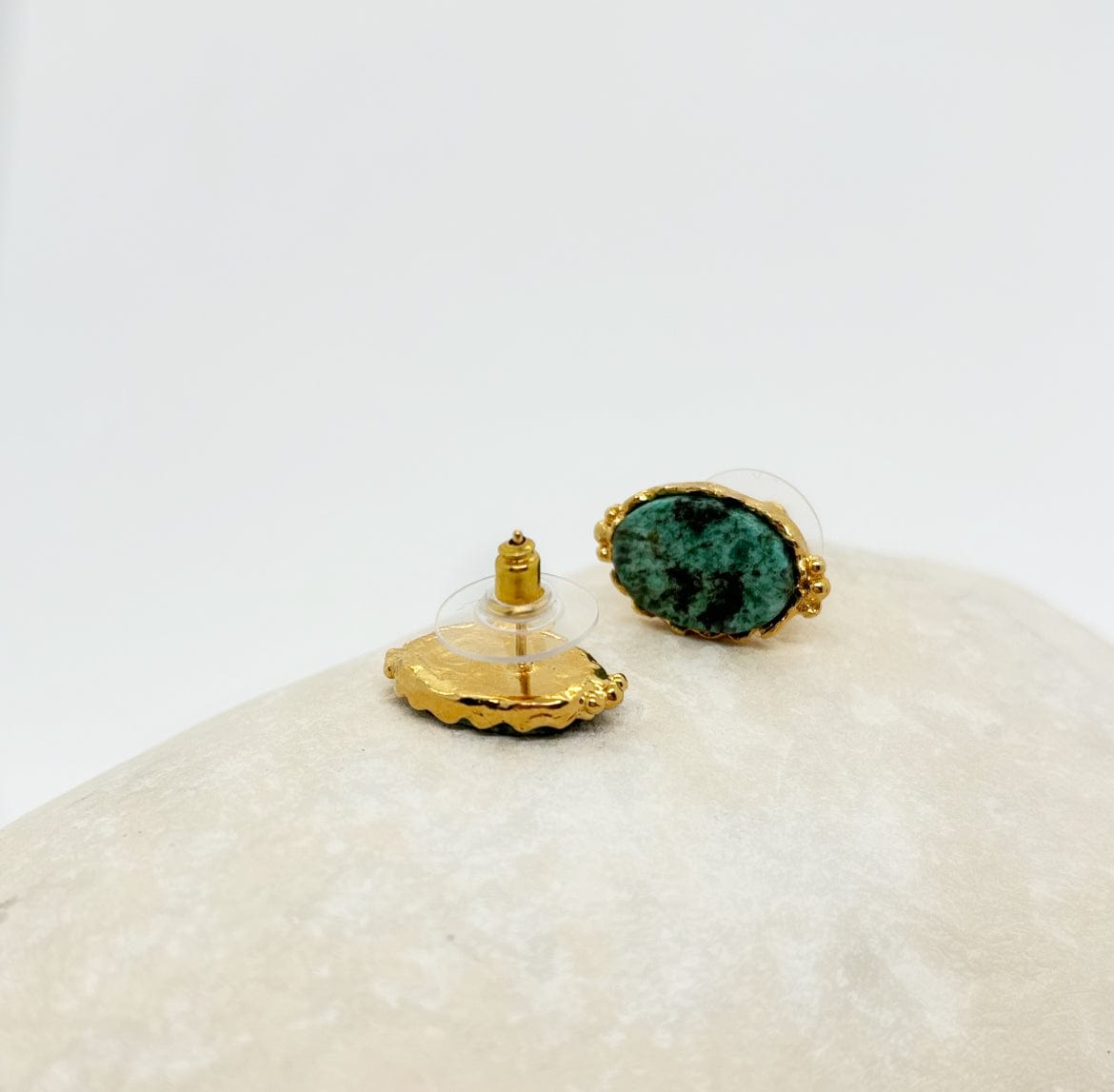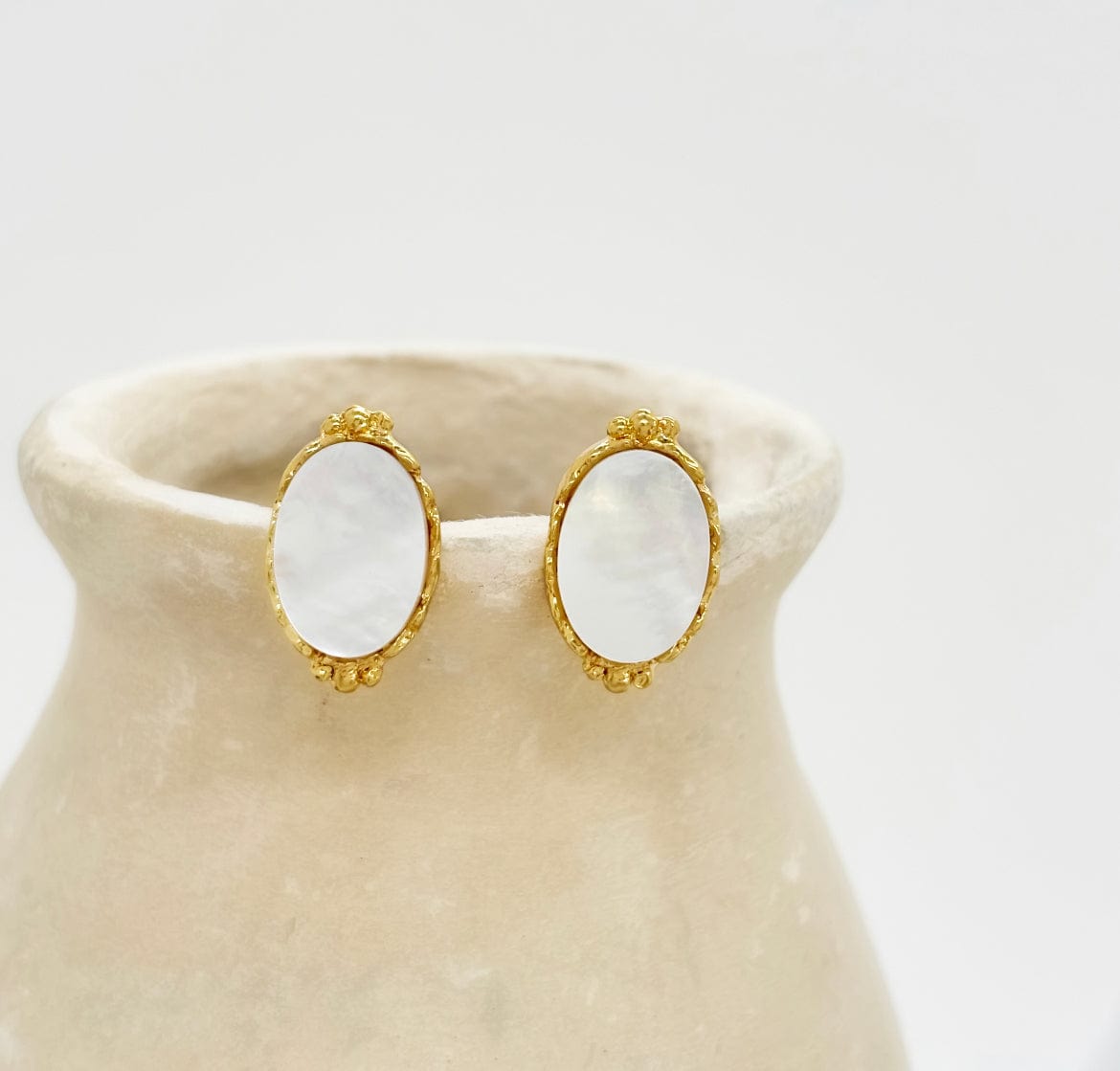 Alliance de précieux et de délicatesse, ces boucles d’oreilles Panagia, façon puces d'oreilles sont parées de délicates pierres naturelle, Nacre blanches ou Turquoise d'Afrique. Cette pièce intemporelle aux formes imparfaites ne vous quittera plus.