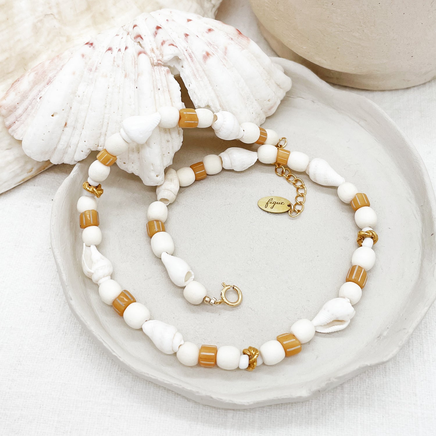 Collier Babor ajustable pour enfants et grands ! Mélange de perles de bois, verre et coquillages et de délicates perles dorées d'or 24 carats. Une pièce aux douces couleurs d'été, qui nous renvoie directement sur les plages de notre enfance.