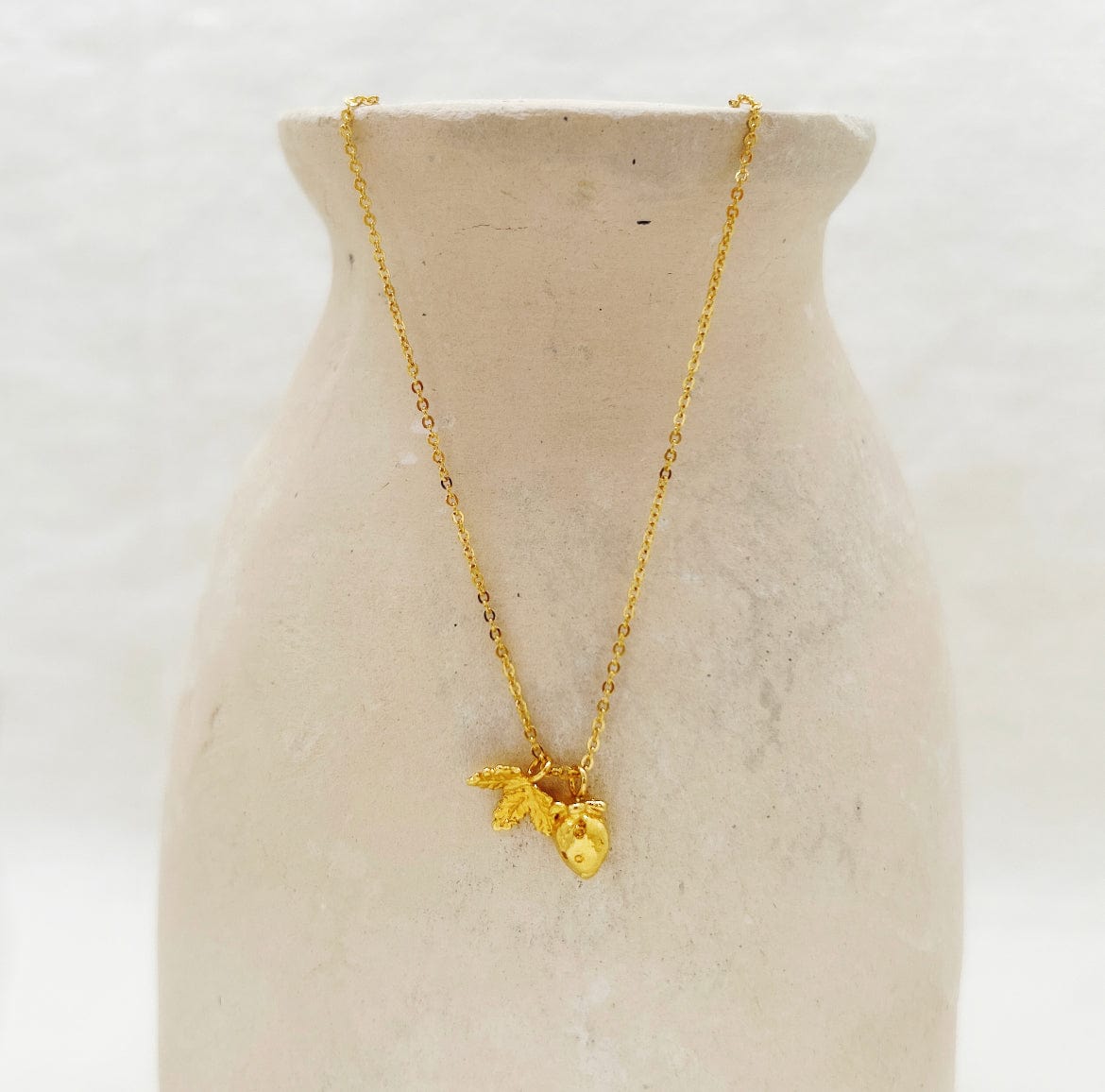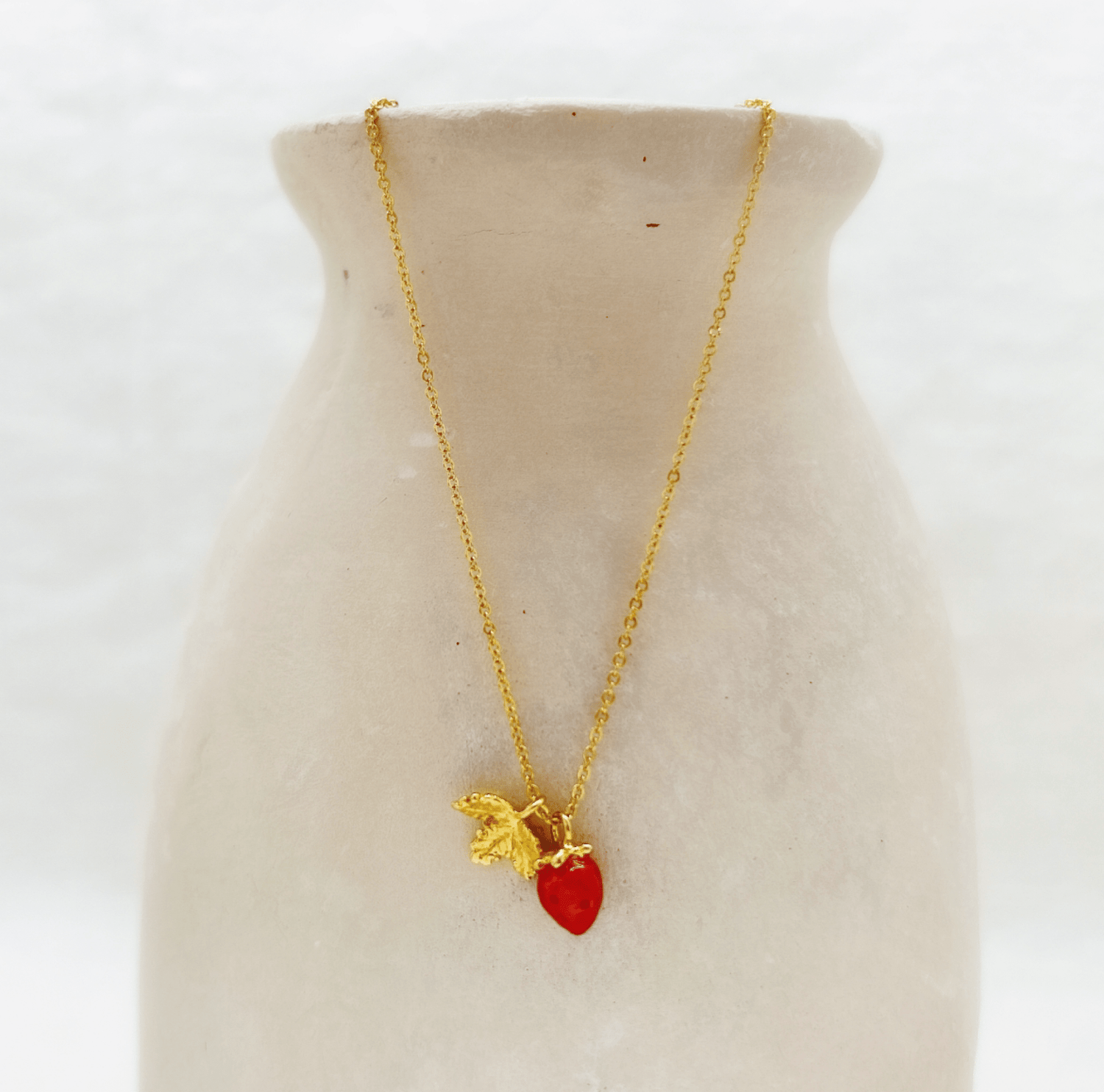 Berris est un délicat collier doré à l'or recyclé 24 carats, réalisé artisanalement à Paris. Une fine chaîne en mailles forçat accompagnée d'une adorable breloque en forme de baie, déclinable en rouge ou en or jaune. Légère, joyeuse et discrète, Fraisis est la pièce parfaite pour apporter une touche de douceur et une note charmante et sucrée.