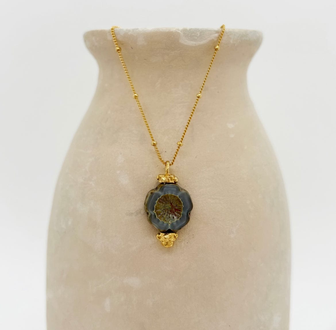 Fabriqué dans notre atelier à Paris, le collier Faro à la chaîne délicatement perlée et orné d’un pendentif en perle de verre gravé à la forme de fleur est parfait pour habiller vos tenues en toutes saisons.