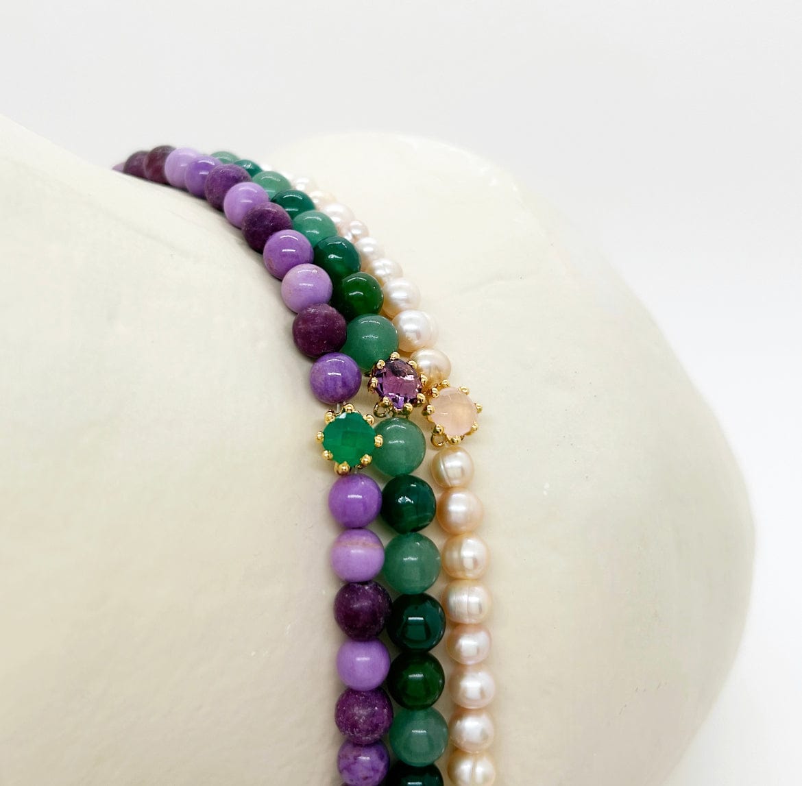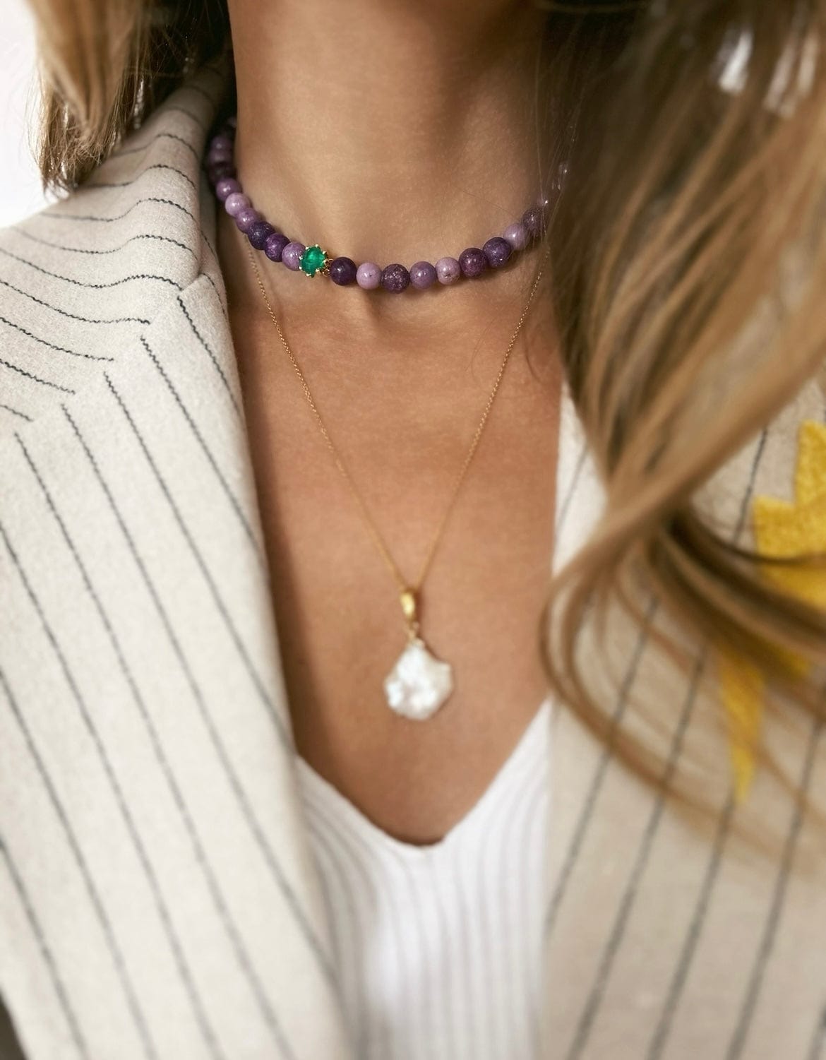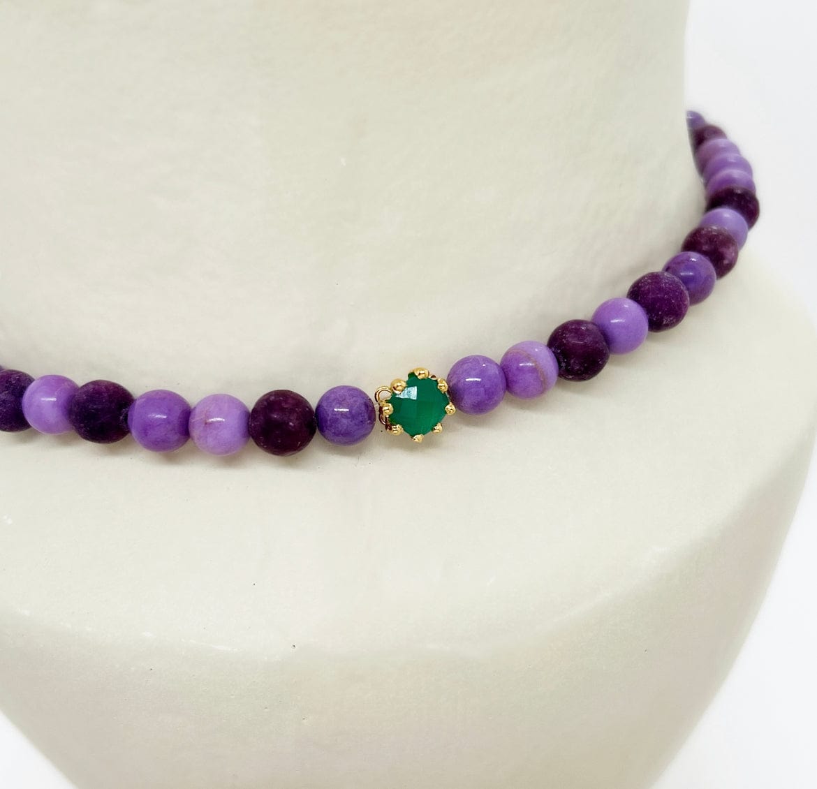 - Collier mauve : mélange de pierre naturelles Lépidolite + serti pierre verte : Onyx vert naturel.