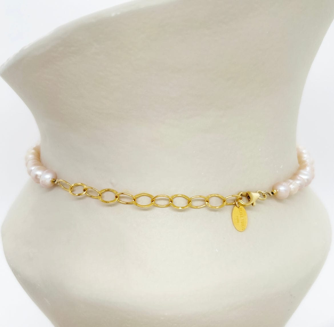 - Collier nude : Perles de culture + serti pierre nude : Calcédoine rose naturelle.