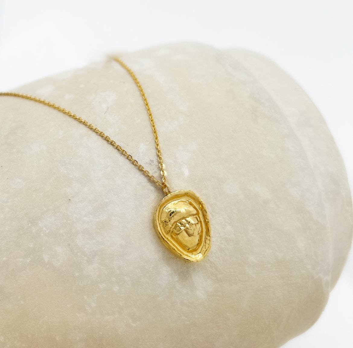 Réalisé à Paris, le collier Kari est composé d'un joli pendentif en forme tête de Pope Orthodoxe, directement inspiré de l'histoire et la culture de la créatrice. Une pièce de caractère, lumineuse, au fini texturé.
