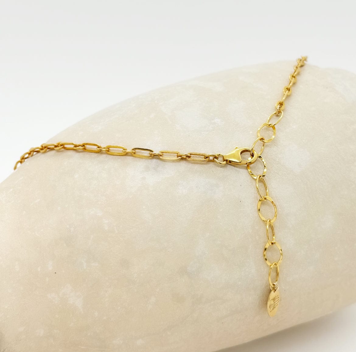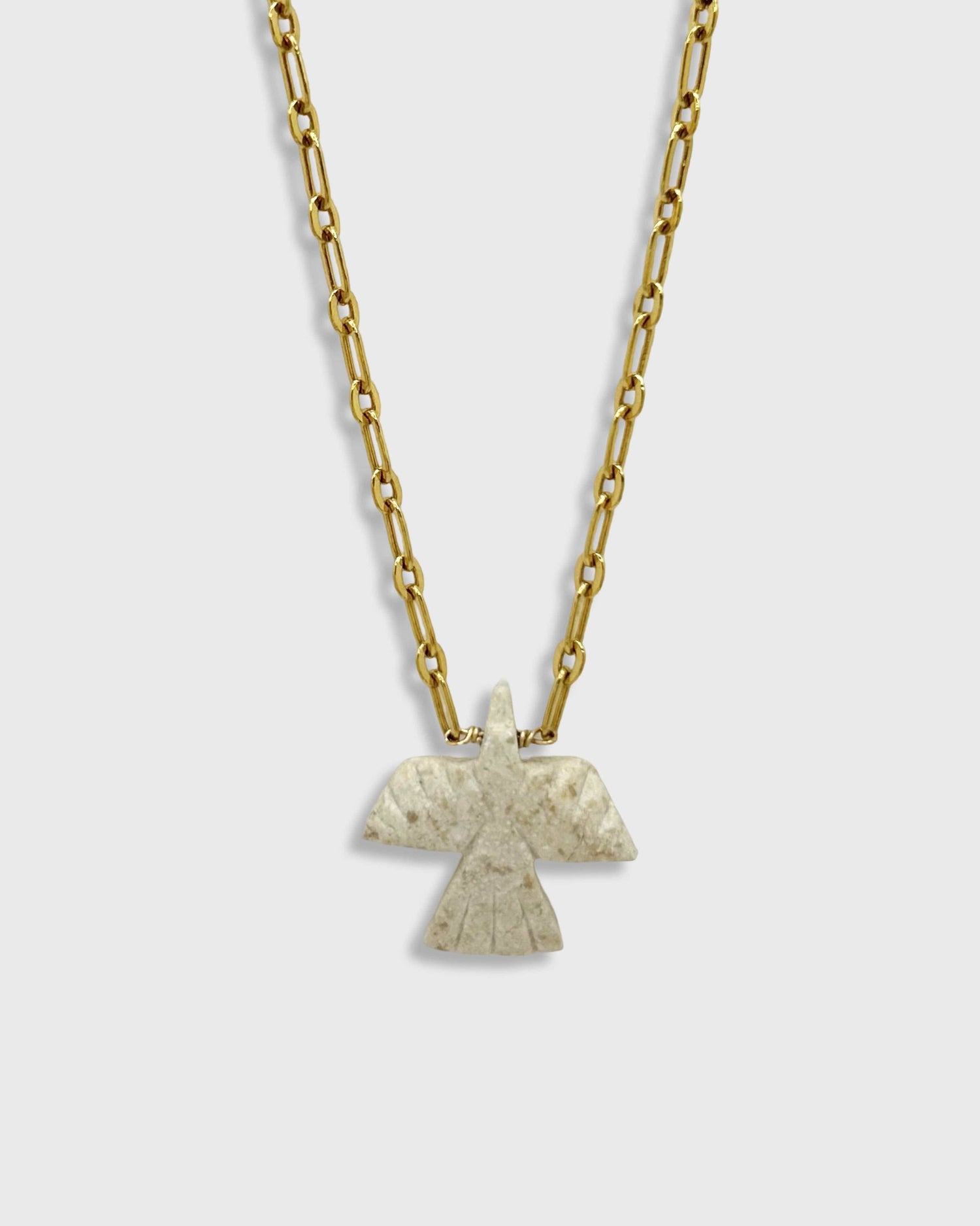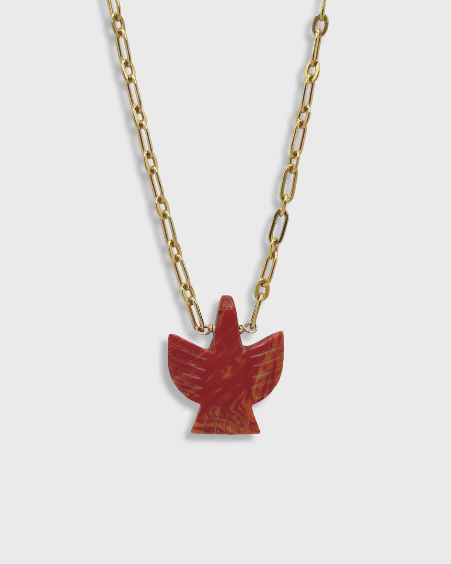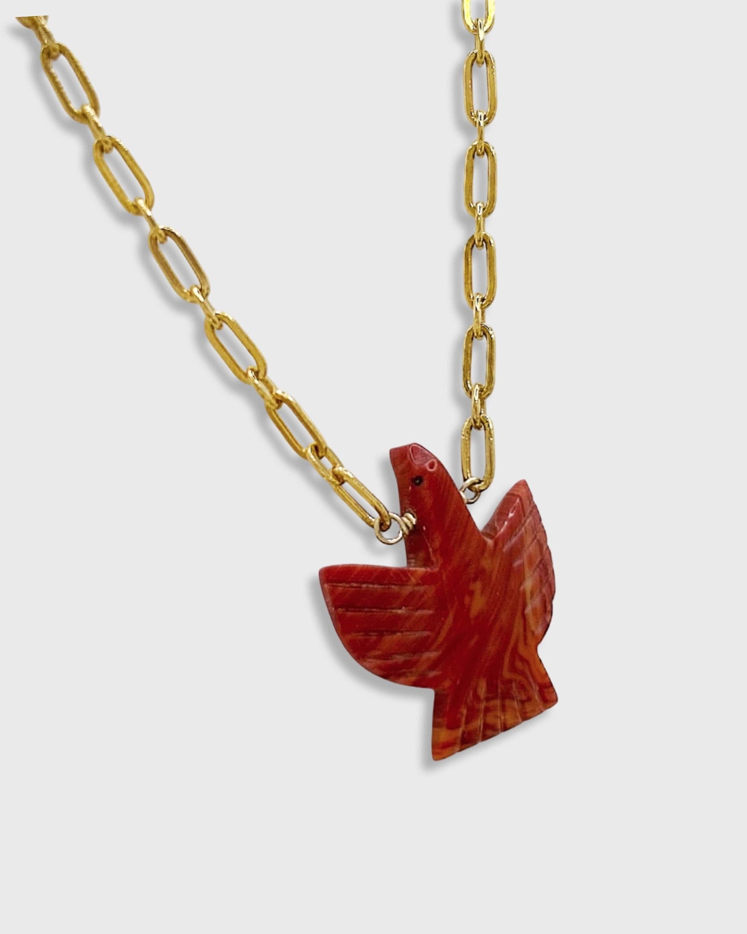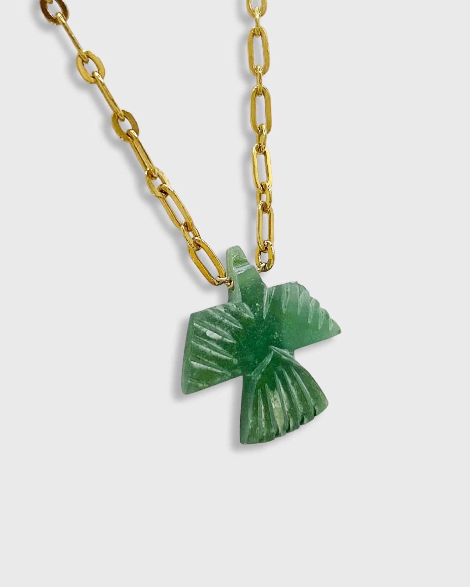 Le collier Pursley célèbre la puissance et la spiritualité avec son pendentif en aventurine naturelle, taillé en forme d’oiseau majestueux. Monté sur une chaîne dorée, il incarne un équilibre entre force et délicatesse. Confectionné à la main à Paris, ce bijou unique allie savoir-faire artisanal et élégance intemporelle.