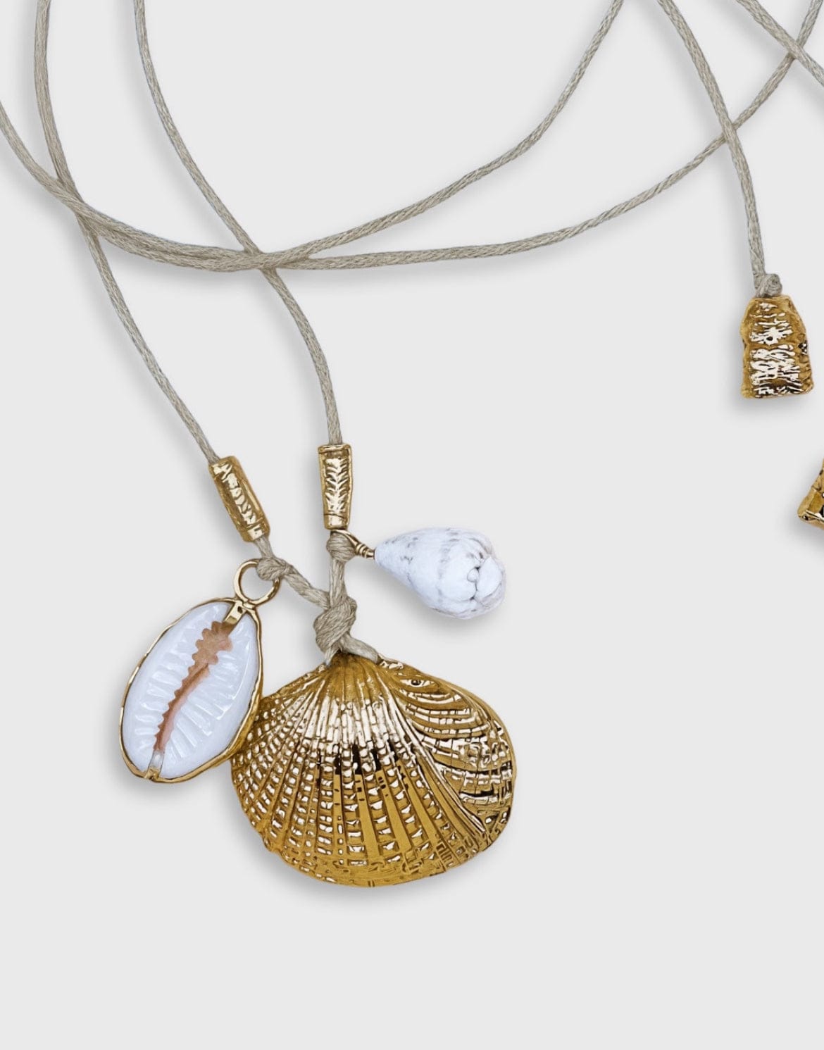 Monté sur un lien 100 % coton, le collier Samos réunit trois pendentifs inspirés de la mer : deux coquillages naturels et une coquille Saint-Jacques dorée à l'or recyclé 24 carats. Chaque élément, soigneusement sélectionné et travaillé, capture l’esprit des rivages méditerranéens. Léger et bohème, il apporte une touche solaire et estivale à toutes vos tenues, comme un souvenir précieux ramené d’une escale au bord de l’eau.