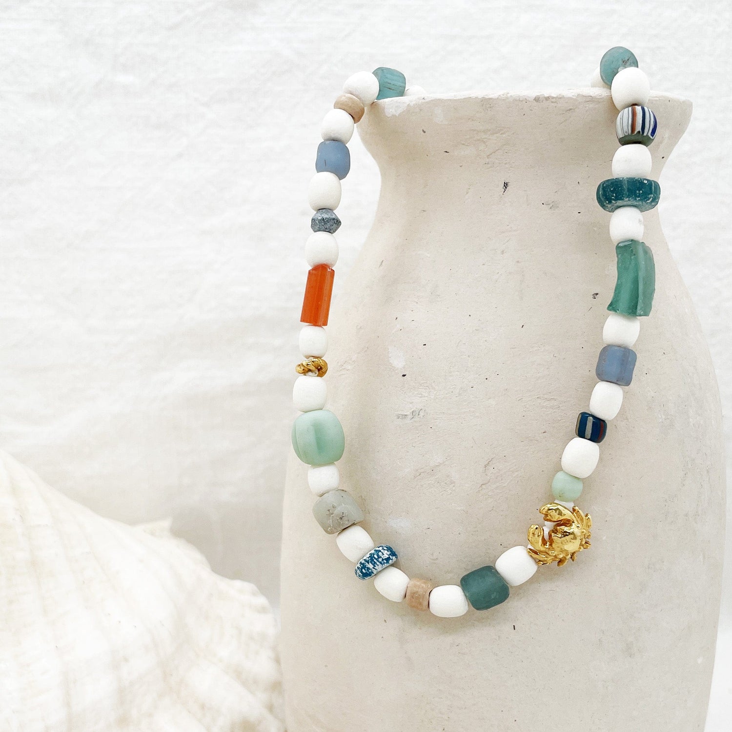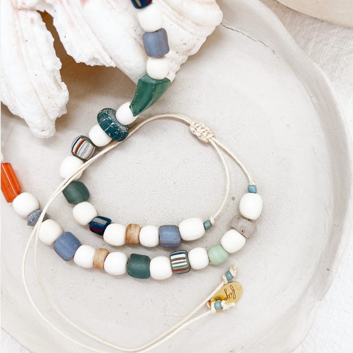 Collier Semaphore ajustable pour enfants et grands ! Construit d'un délicat et solide fil de lin, orné d'un mélange de perles de verre et de pierres naturelles. Une pièce qui nous renvoie directement sur les plages de notre enfance.