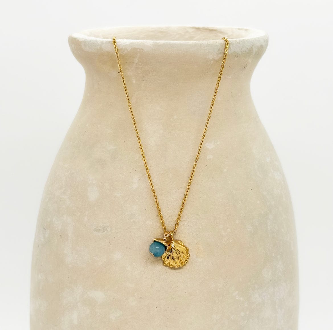 Réalisé avec soin dans notre atelier à Paris et doré à l'or recyclé 24 carats, notre collier Shella se compose d'une fine chaîne à mailles forçat et de deux petites breloques : une délicate perle de Jade bleue, et un joli coquillage. Raffiné et discret, Shella est le premier collier idéal.