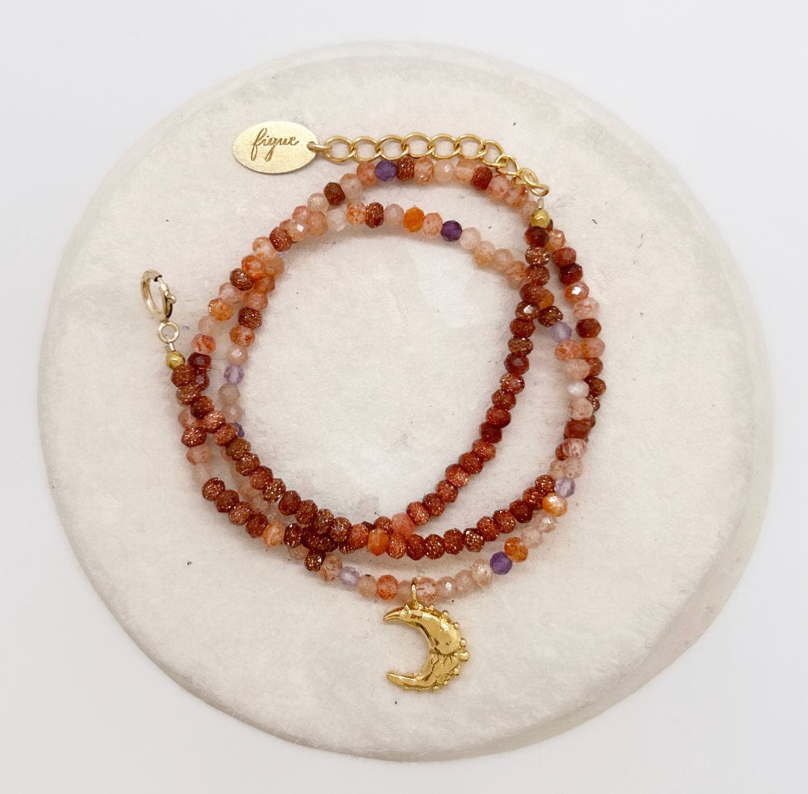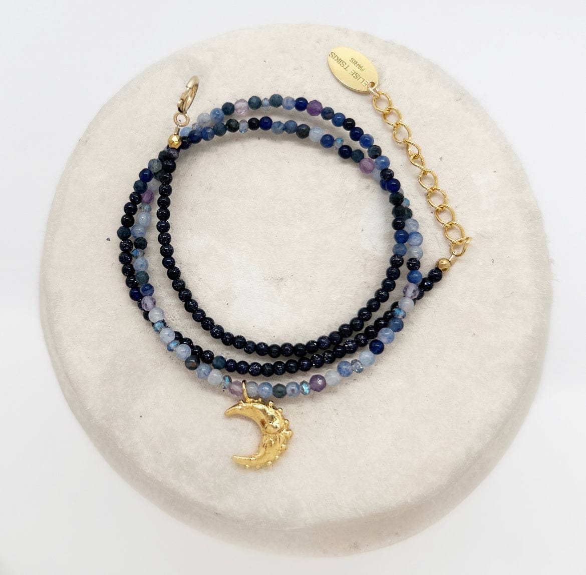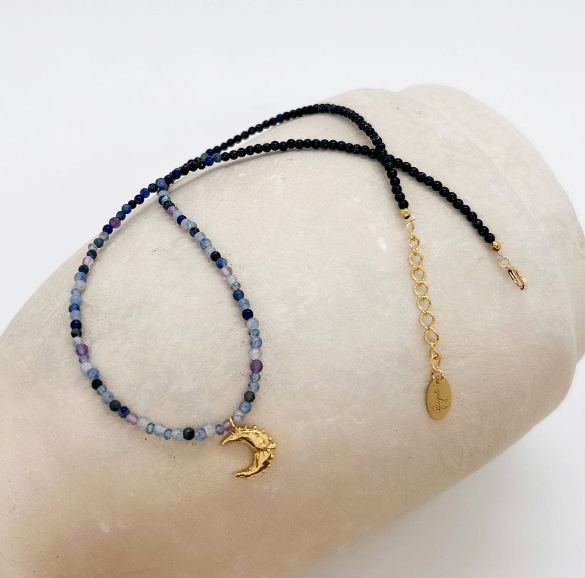 Le collier Songe est une pièce composée d'un mélange de perles semi-précieuses. Il est orné d'une lune, symbole de poésie, de douceur et de lumière. Une association délicate et adorable de couleurs finement réalisées pour accompagner tout au long de l'année.