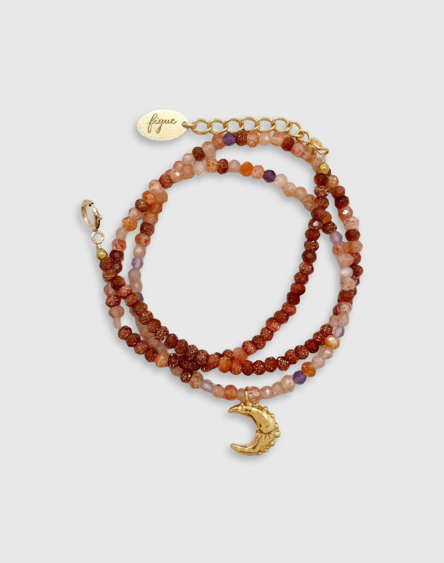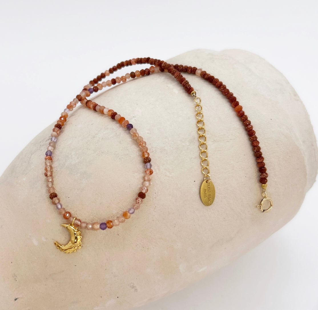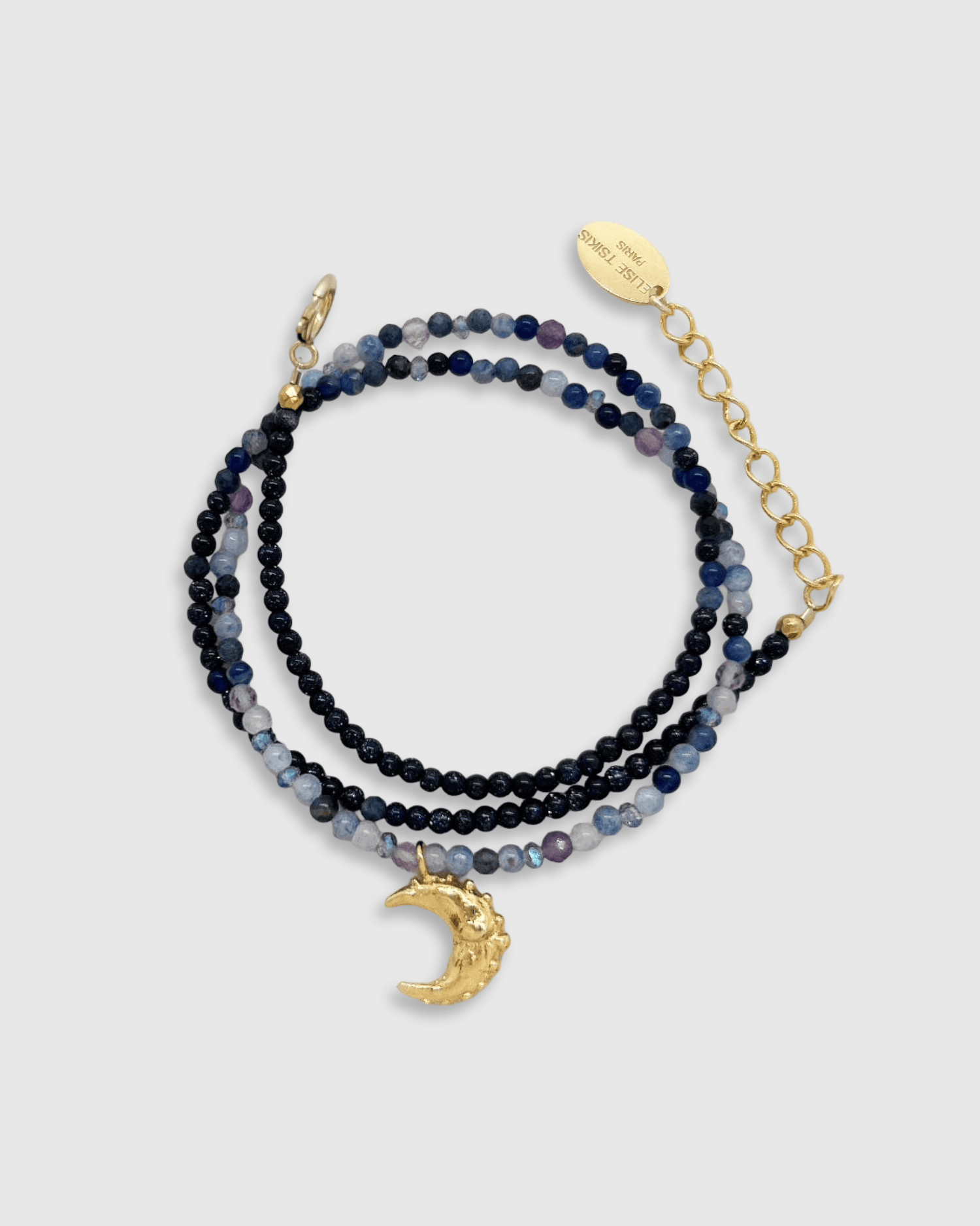 Le collier Songe est une pièce composée d'un mélange de perles semi-précieuses. Il est orné d'une lune, symbole de poésie, de douceur et de lumière. Une association délicate et adorable de couleurs finement réalisées pour accompagner tout au long de l'année.