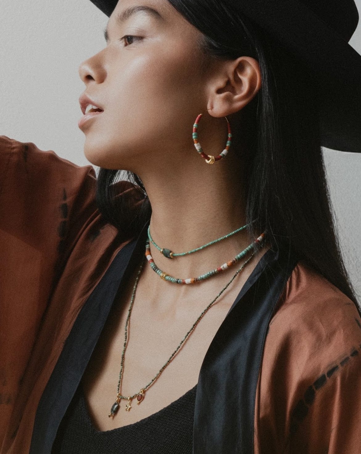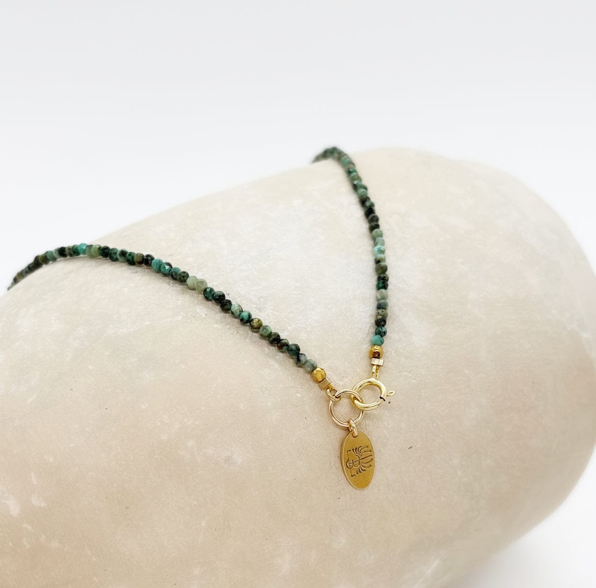 Le collier Tyrone célèbre l’harmonie des contrastes avec ses pierres naturelles. Tout d'abord ses petites perles de Turquoise d'Afrique, sa breloque en Rubis d'Inde, mais surtout sa perle centrale majestueuse en Émeraude d'Inde. Des nuances profondes, minutieusement assemblées à la main dans nos ateliers parisiens. Ses détails dorés captent la lumière et subliment l’éclat des pierres avec raffinement. Élégant et intemporel, ce bijou incarne un équilibre parfait entre nature et savoir-faire artisanal.