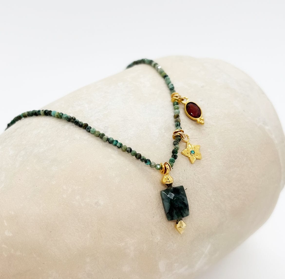 - Qualité perles naturelles : perles de Turquoise d'Afrique, Grenat rouge et perle Émeraude d'Inde.