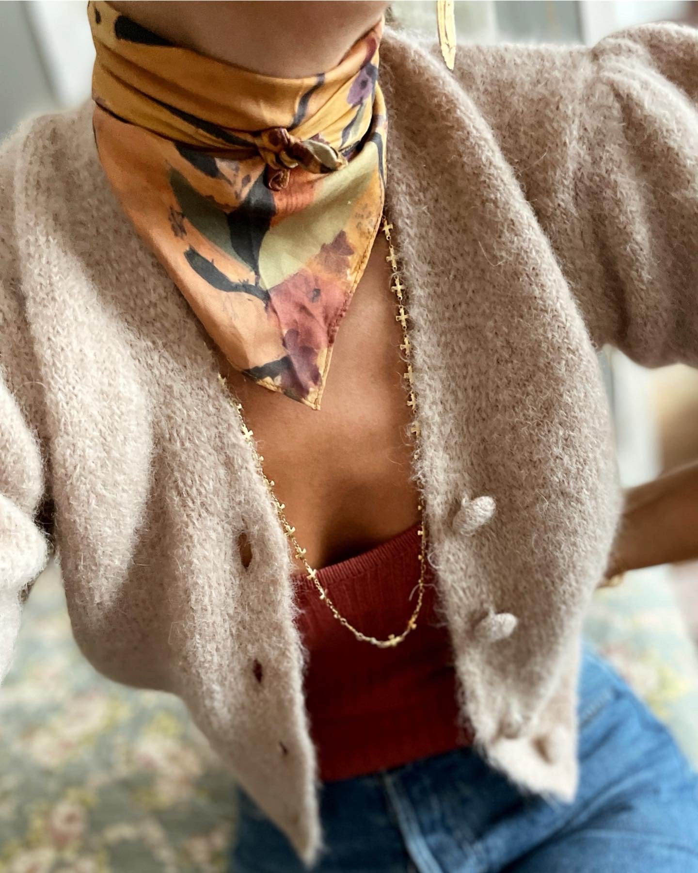 Le mannequin porte notre foulard Sierra 100% soie en 50 cm x 50 cm.