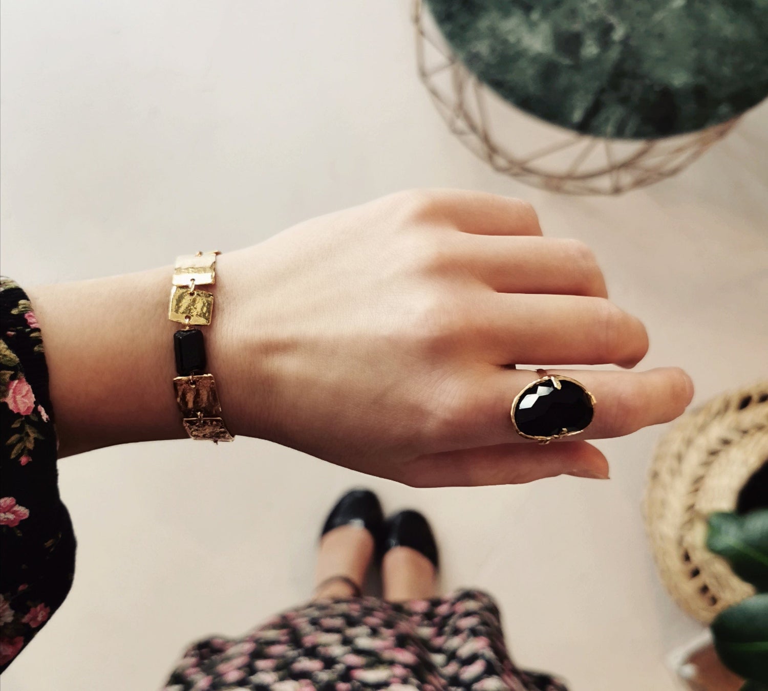 Fabriquée à la main en France, la bague Itone est composée d'une audacieuse pierre d'Onyx noir naturel. À la taille ajustable, cette bague est étonnement légère et s'adaptera à tous vos doigts. Portez-la seule ou parmi une accumulation d'autres modèles, Le seul mot d’ordre étant amusez-vous !