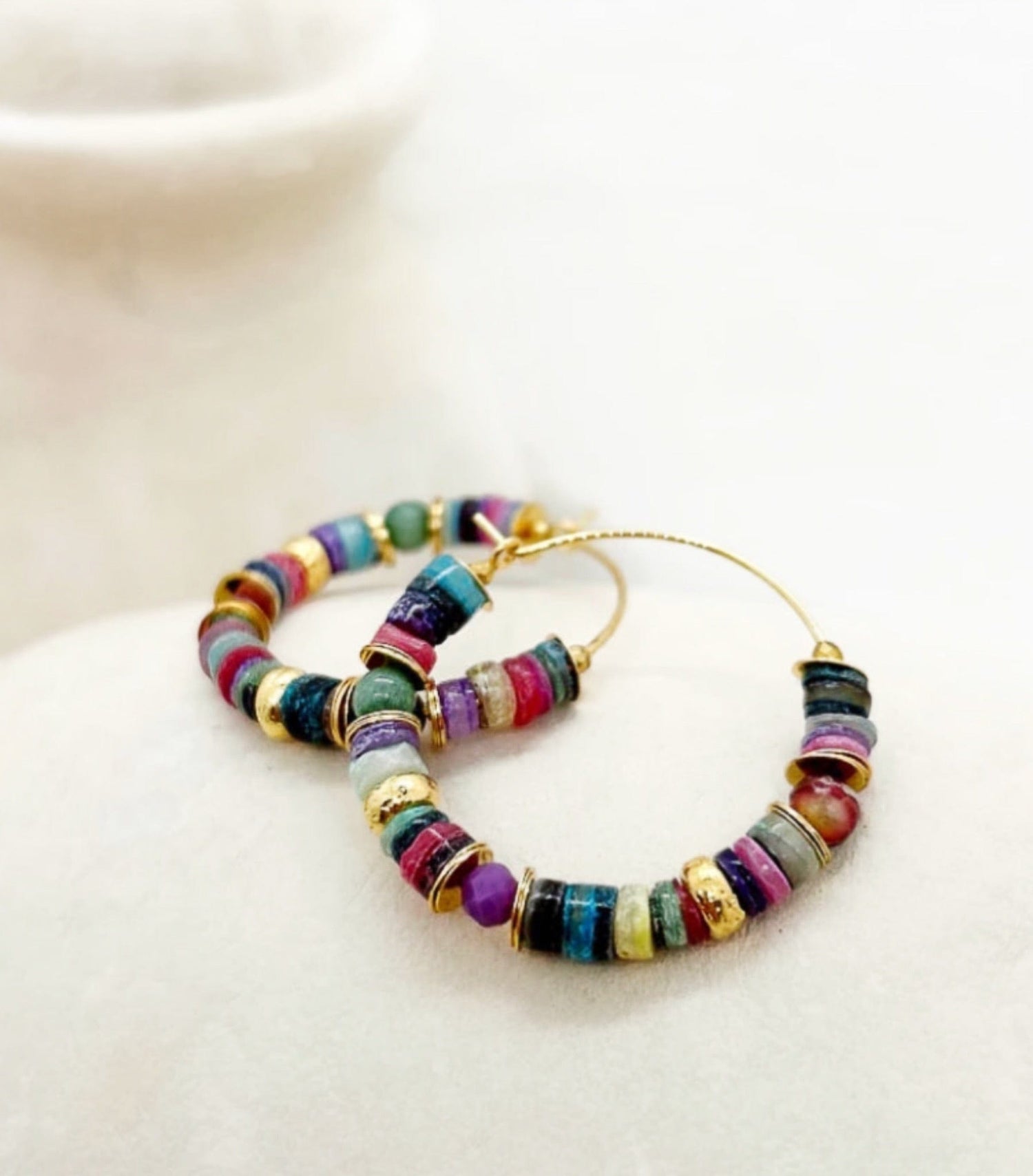 Confectionnées avec délicatesse dans notre atelier à Paris, les créoles Teglia pour oreilles percées révèlent éclat et allure aux couleurs hivernales tout en capturant la lumière grâce aux pierres naturelles. Composées de coquillages teintés, des pierres de Jade et de phosphosidérites, ces boucles d'oreilles créoles vous accompagneront au quotidien.